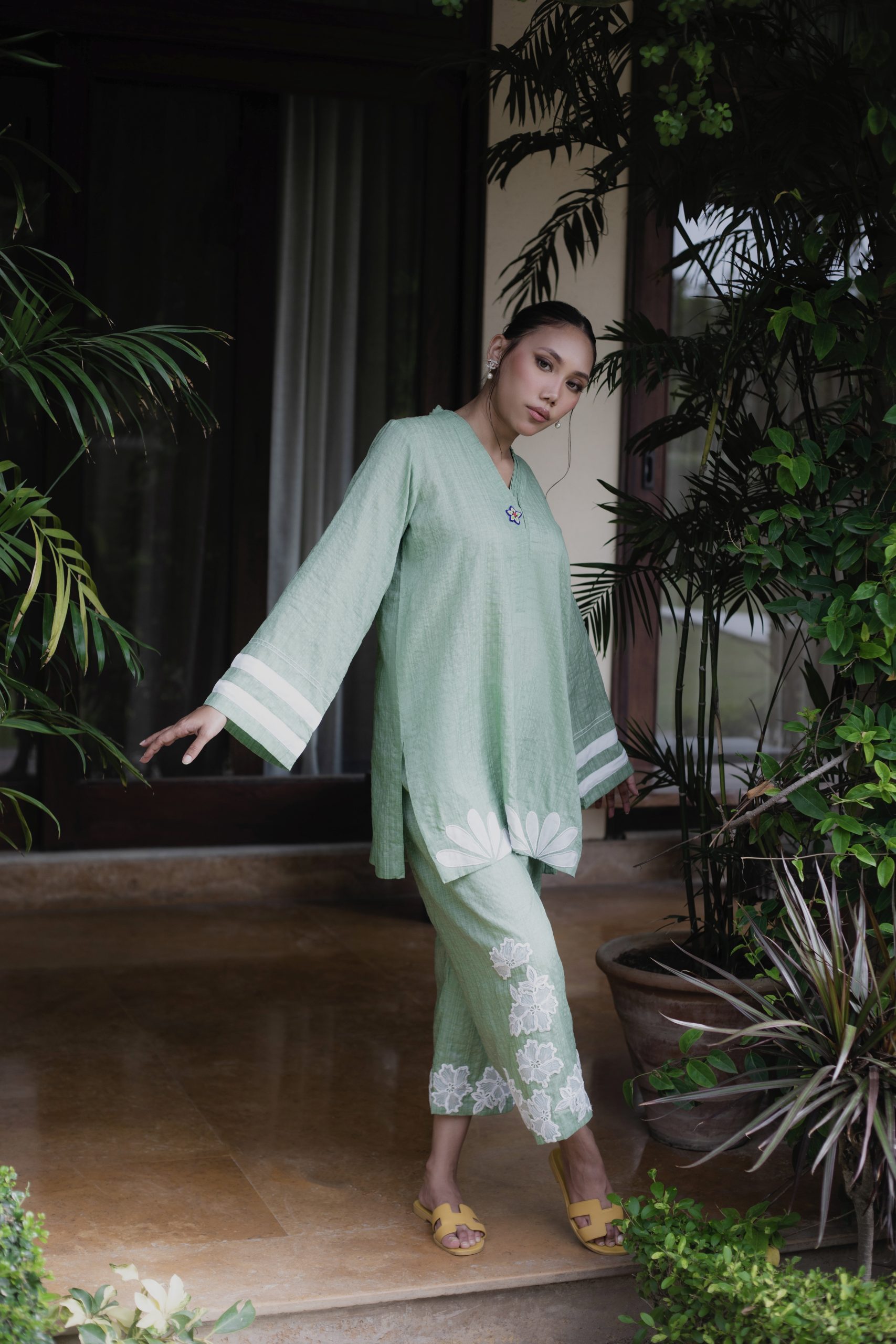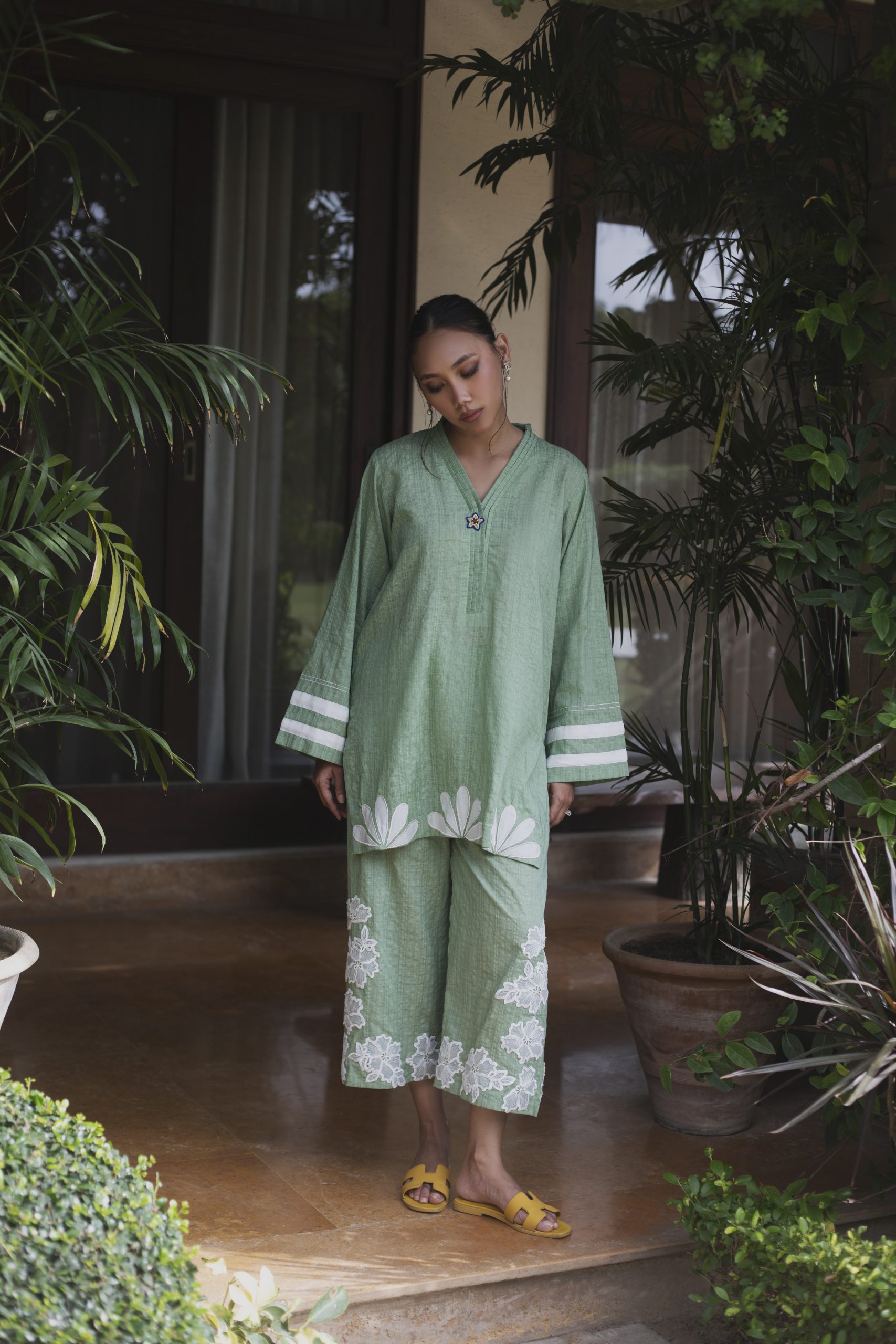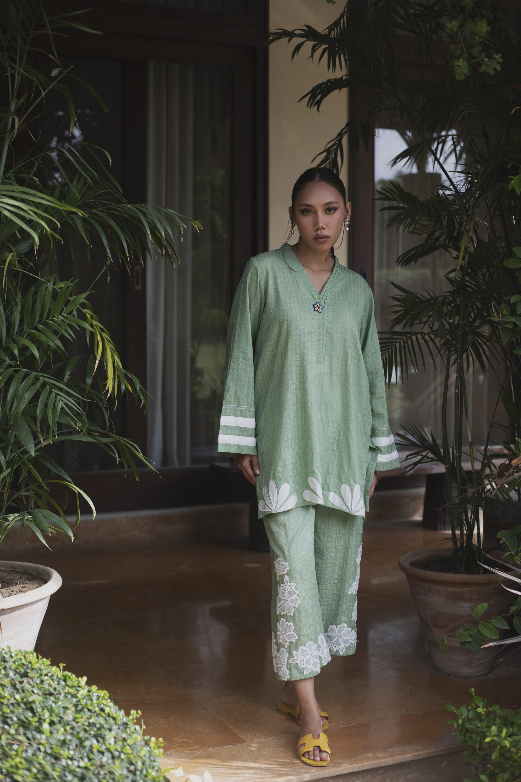 Description – A refreshing mint green ensemble featuring delicate appliqué work on the shirt,