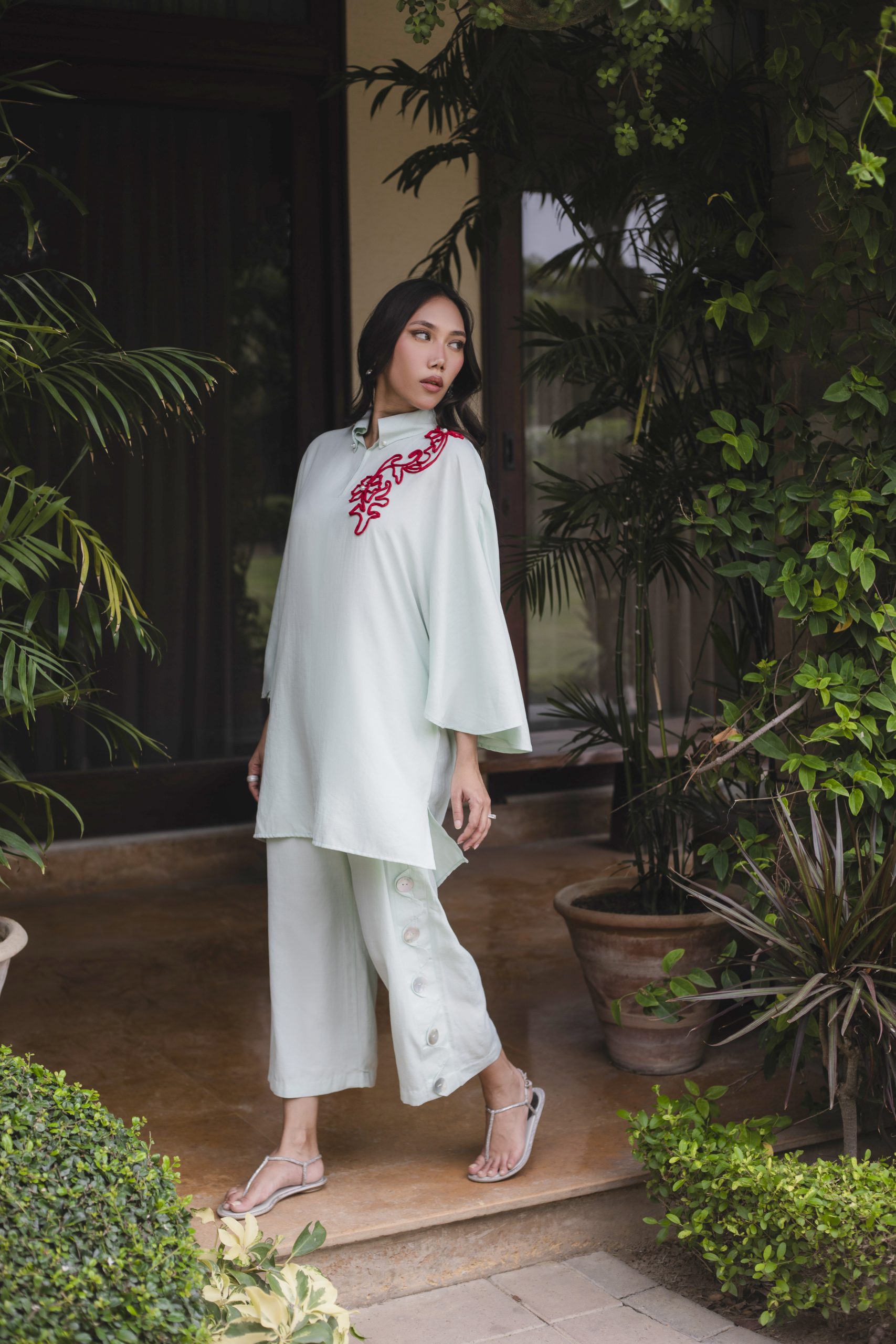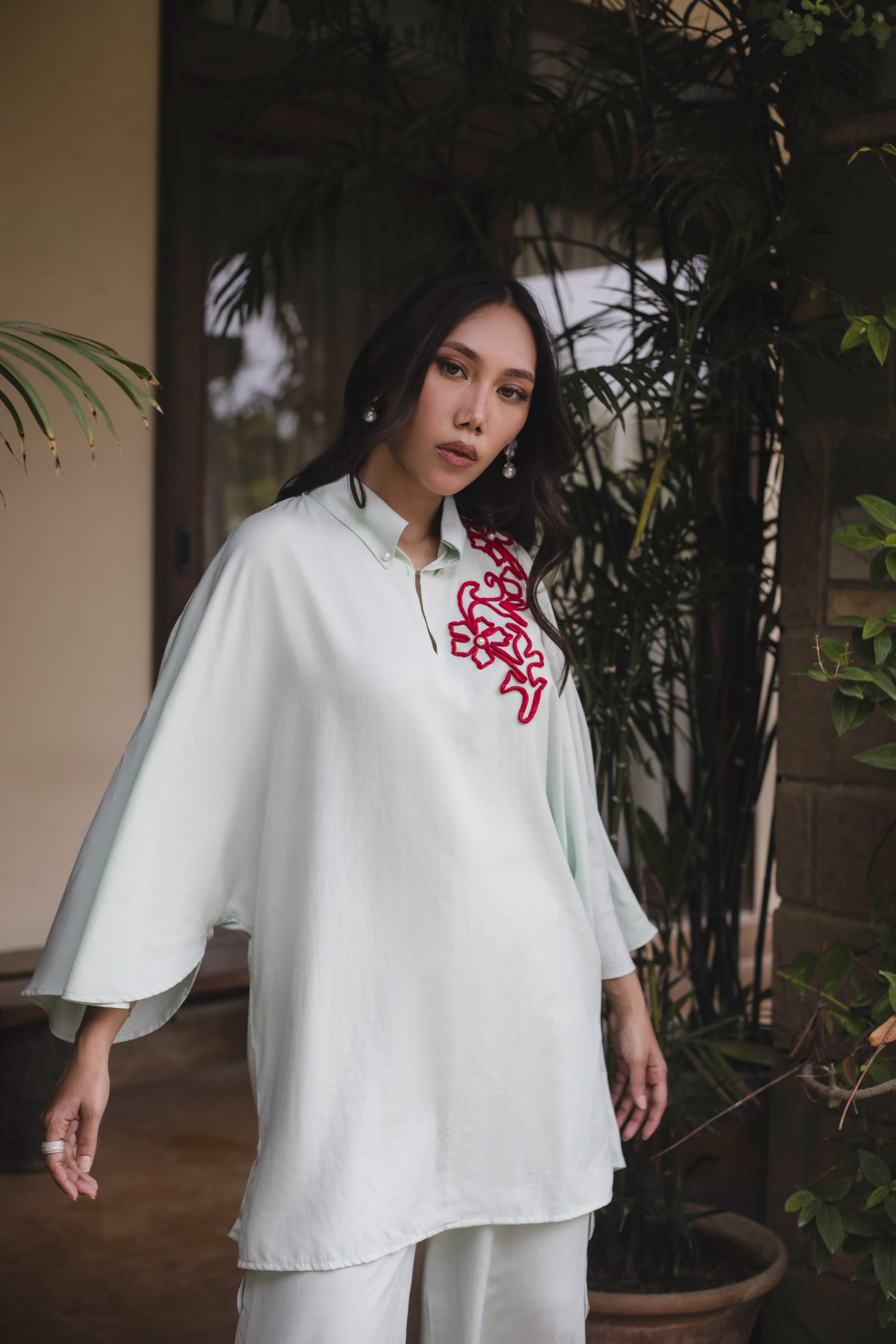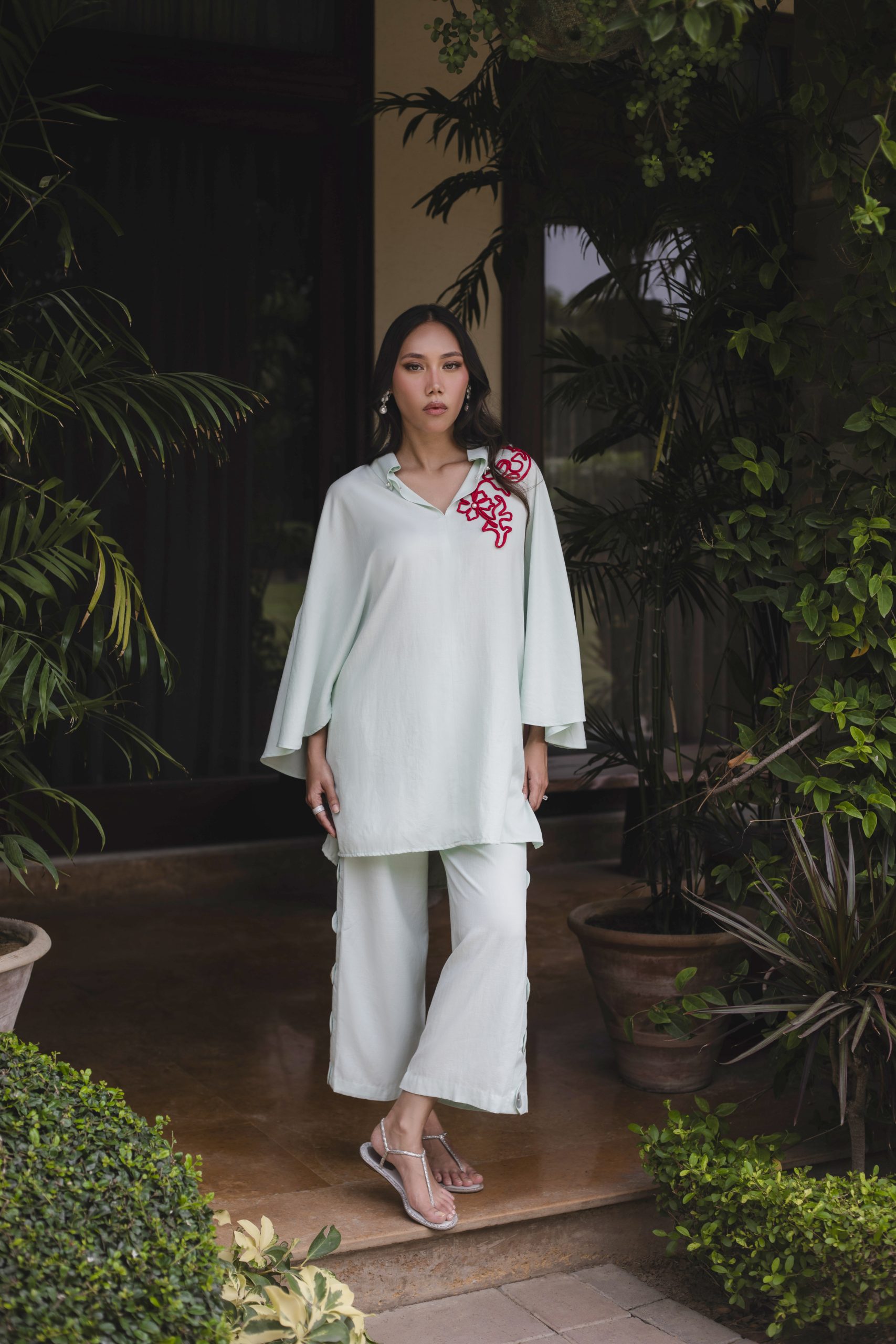 the shirt and paired with chic fancy izaars. The cool hue and subtle embellishments make it an